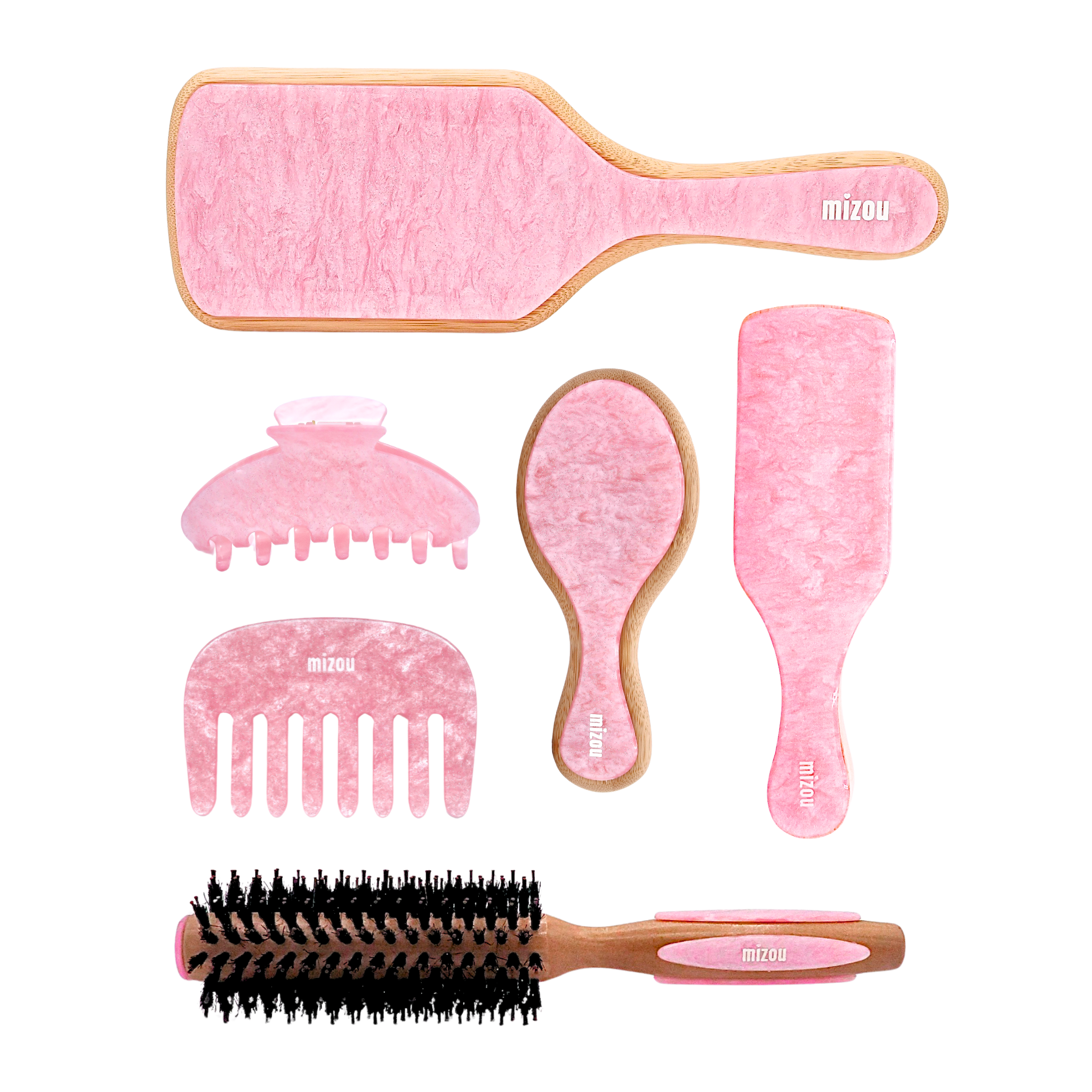 Includes: 1x Bamboo Paddle Brush, 1x Round Brush, 1x Mini Boar Bristle Brush, 1x Mini Brush, 1x Eternal Hold Clip, 1x Mini Comb