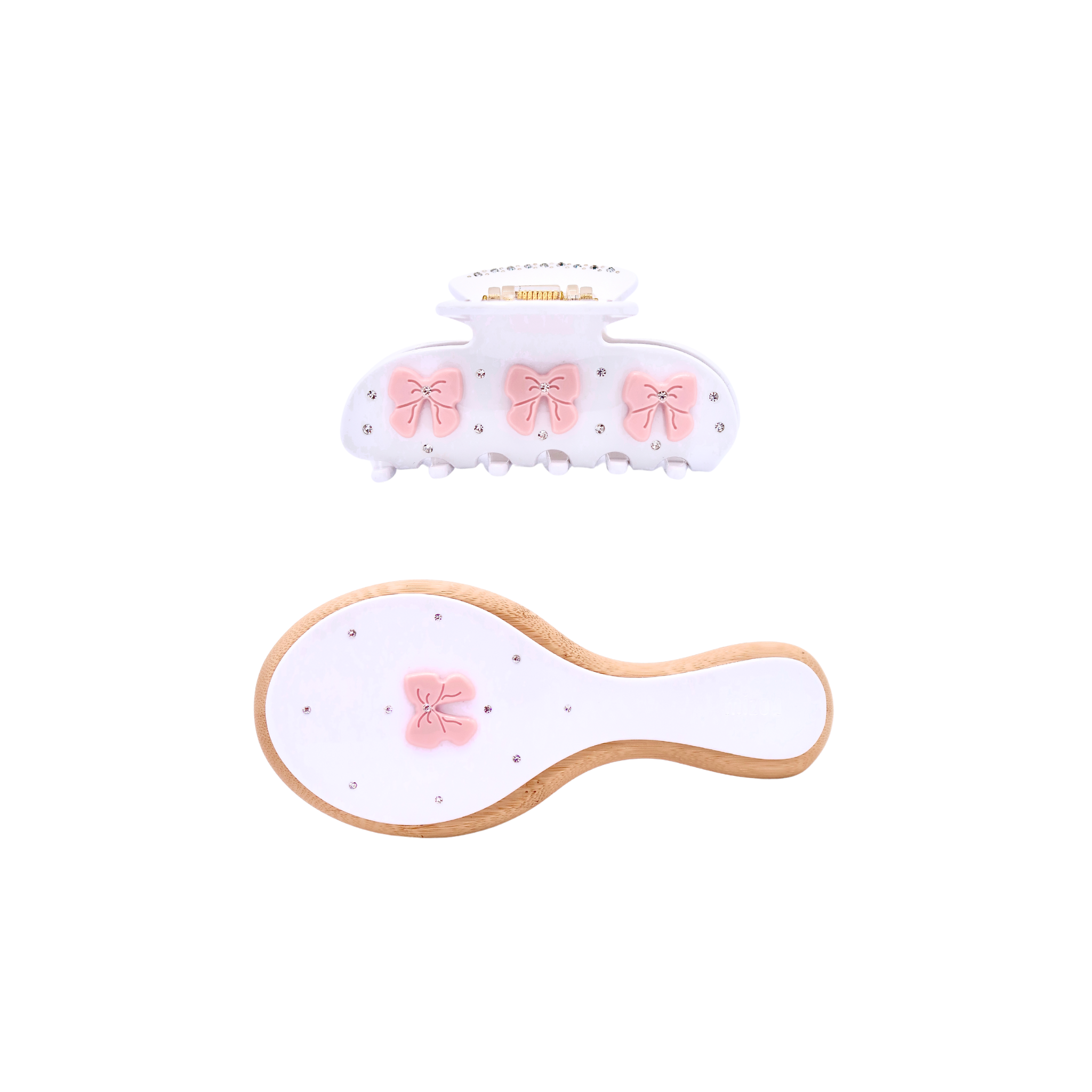 Perfect for on-the-go styling, our 2-piece matching set includes a Princess Clip and Mini Brush—two must-have accessories designed for effortless styling throughout your day. The Princess Clip, adorned with delicate crystals and handcrafted from biodegradable acetate, adds a touch of elegance to any look, while the Mini Brush, crafted entirely from bamboo and cellulose acetate, offers gentle detangling and smooth styling. Compact and travel-friendly, both pieces can fit easily into your bag, making them the perfect companions for quick touch-ups or adding a polished finish wherever life takes you.